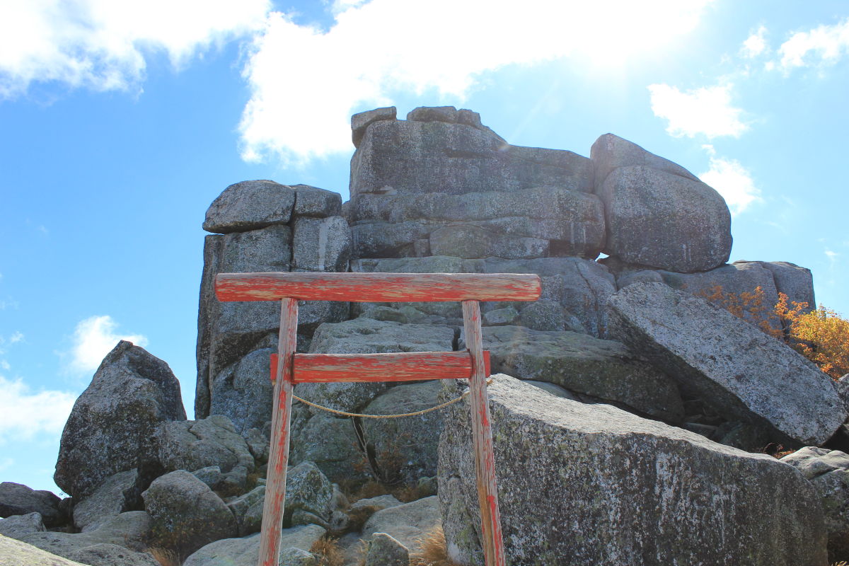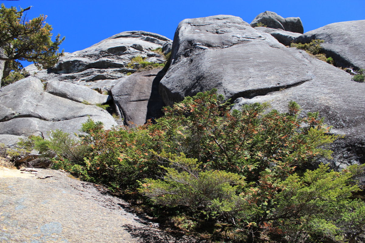 急坂ではないけれど、険しい道のりをひたすら進み、突き出た岩壁の下を廻るようにゆくと、普通の山じゃないな、と実感。瑞牆山山頂は、岩の上だった。単純にすげえ。