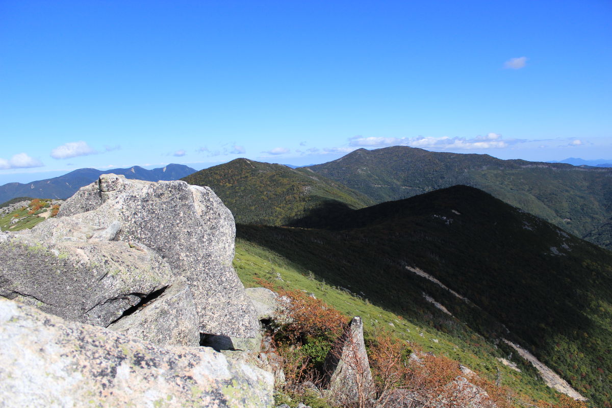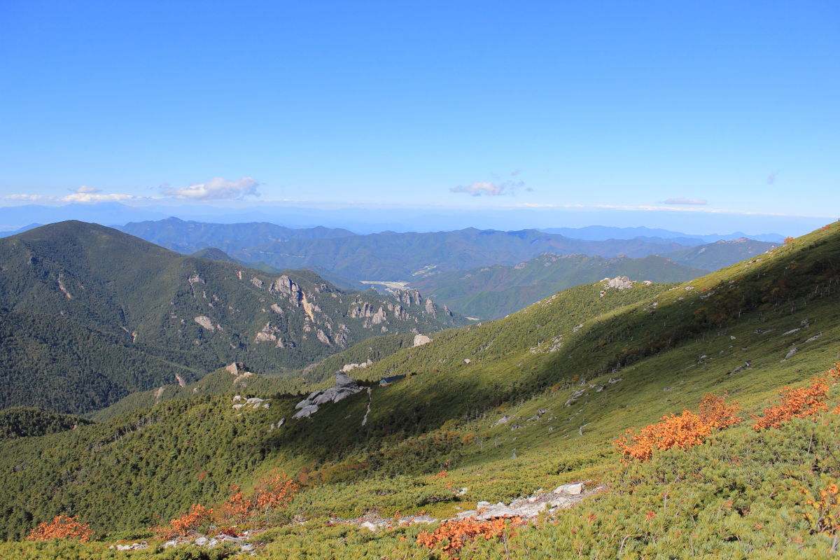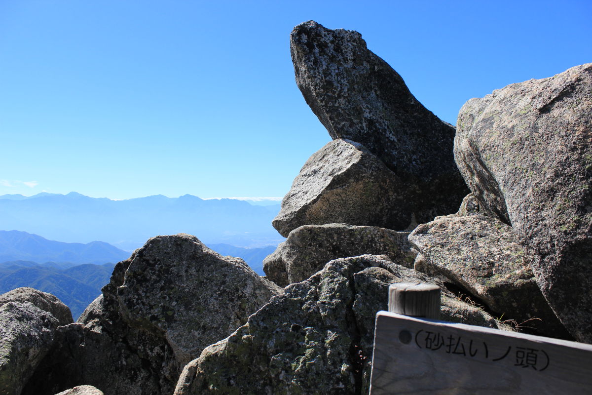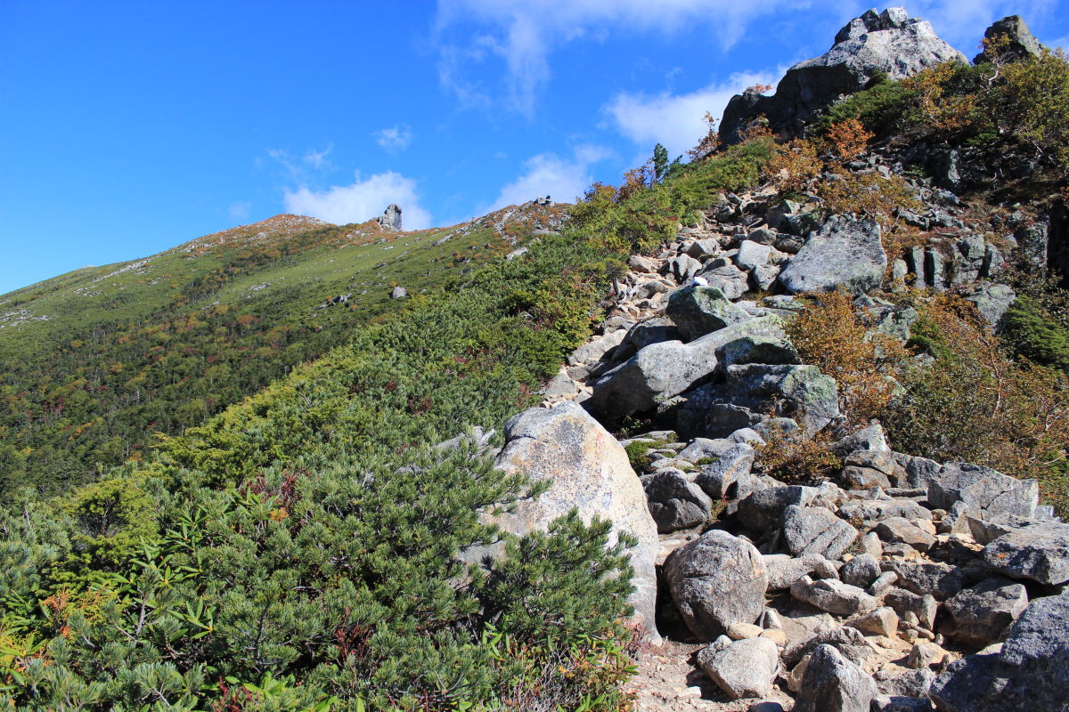 砂払ノ頭を越えると、森林限界の上。天気は絶好! そこからは岩場混じりで、日本アルプスではないとはいえ、スケールは抜群。