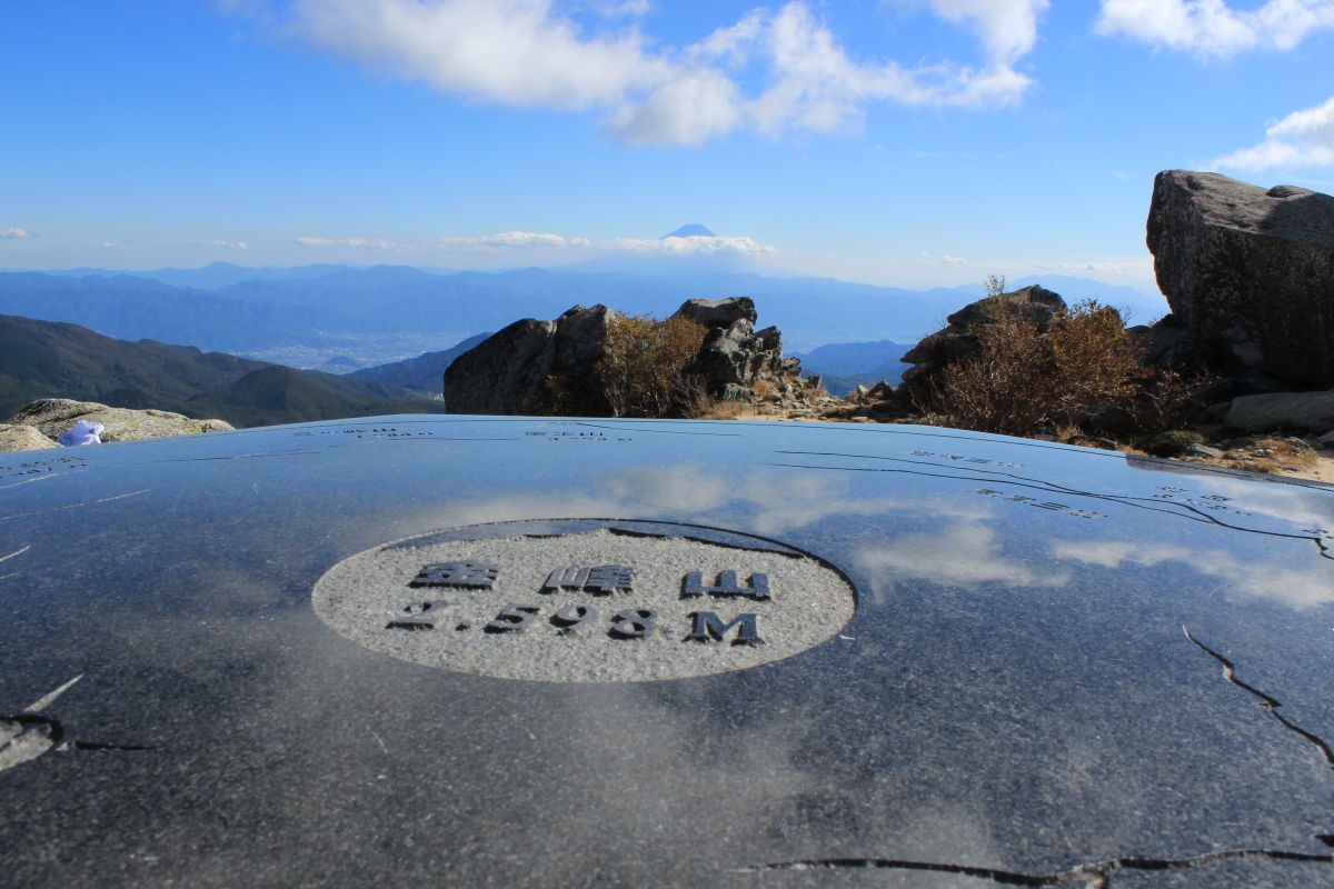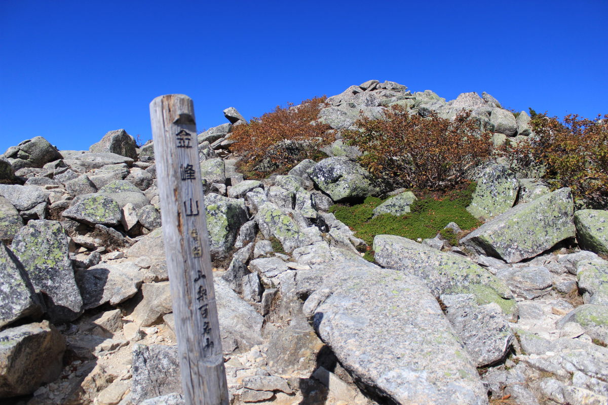 二時頃、金峰山到着! 標高は2595メートルで、瑞牆山荘から千メートル近く高度を上げた計算。先月の北岳は撤退したぶん、達成感はひとしお。