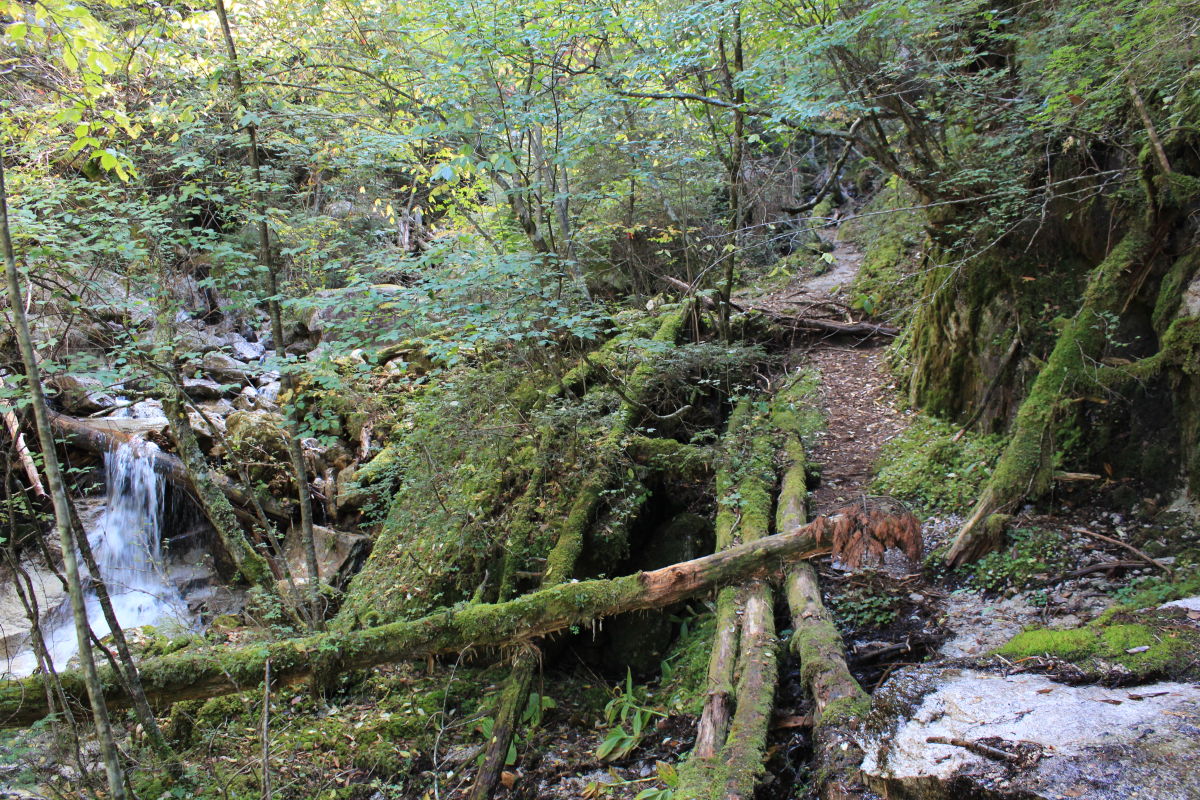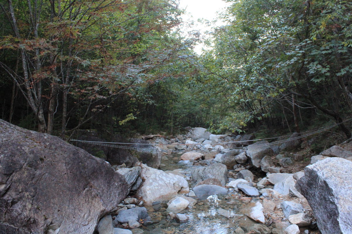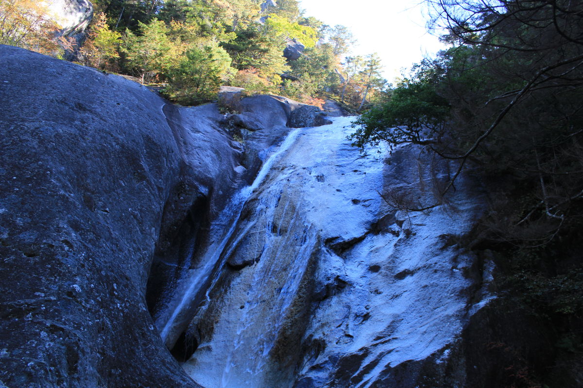 充実感をたっぷり味わいながら、黒森コースの方に下山。エアリアには赤字で荒れていると書かれているけれど、正直大したことないだろうとたかを括っていた。が、想像以上に歩きにくく、道がわかりにくい。不動滝に出るまえに一度、道を間違え、少し迷った。沢沿いの赤布が変なところに続いてるもんだから……!