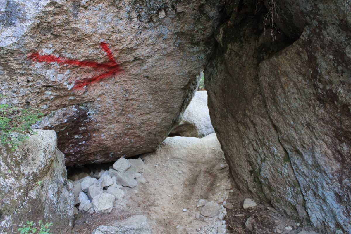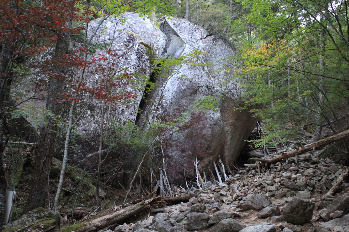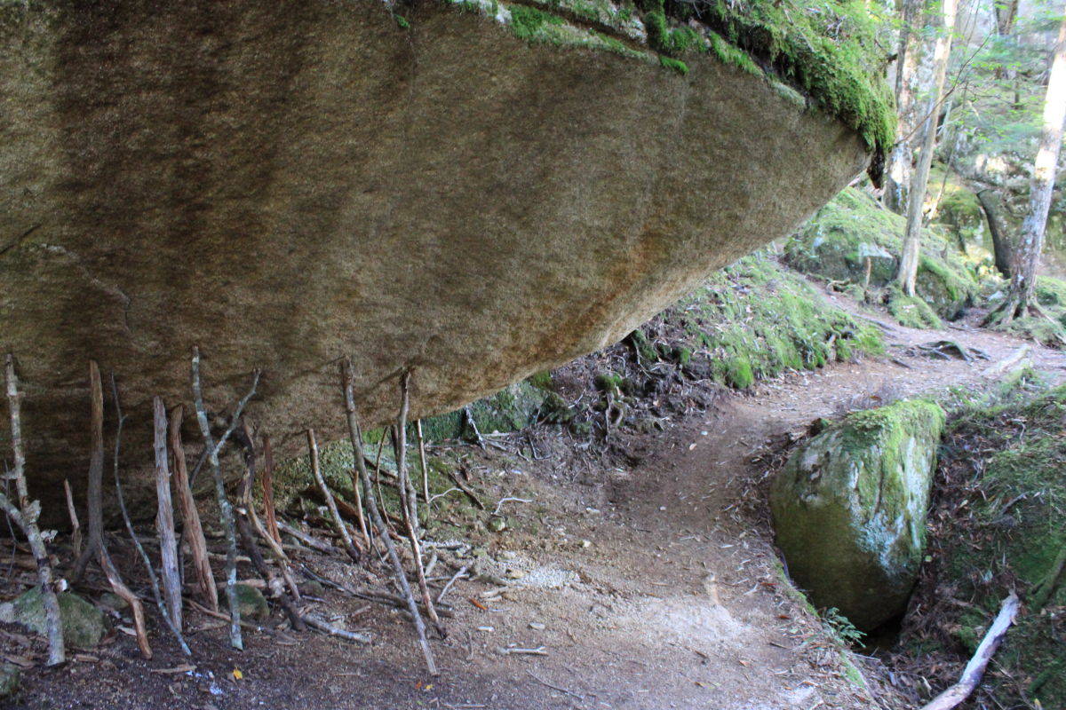真っ二つに割れた大岩。見にくいけれど右側に道