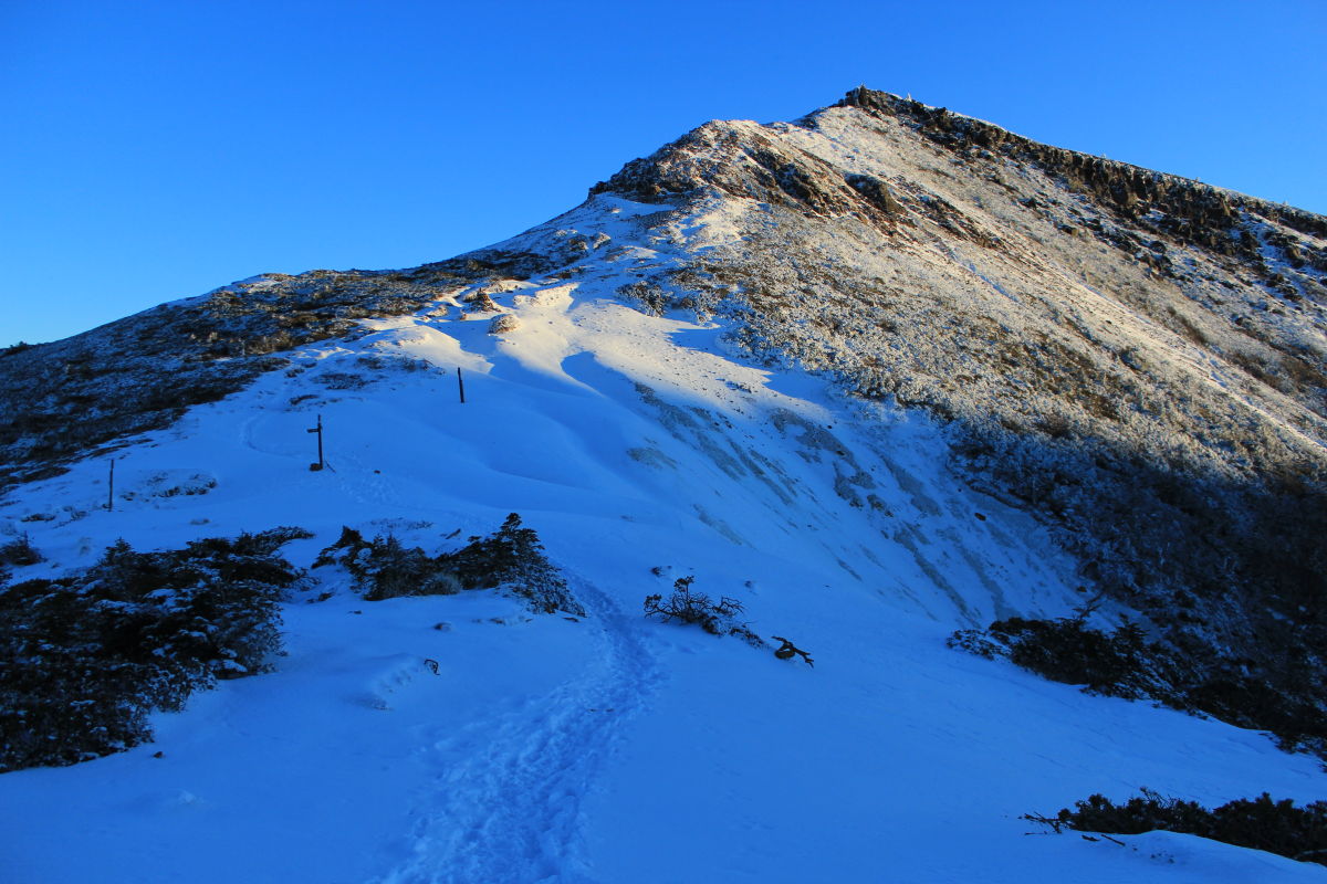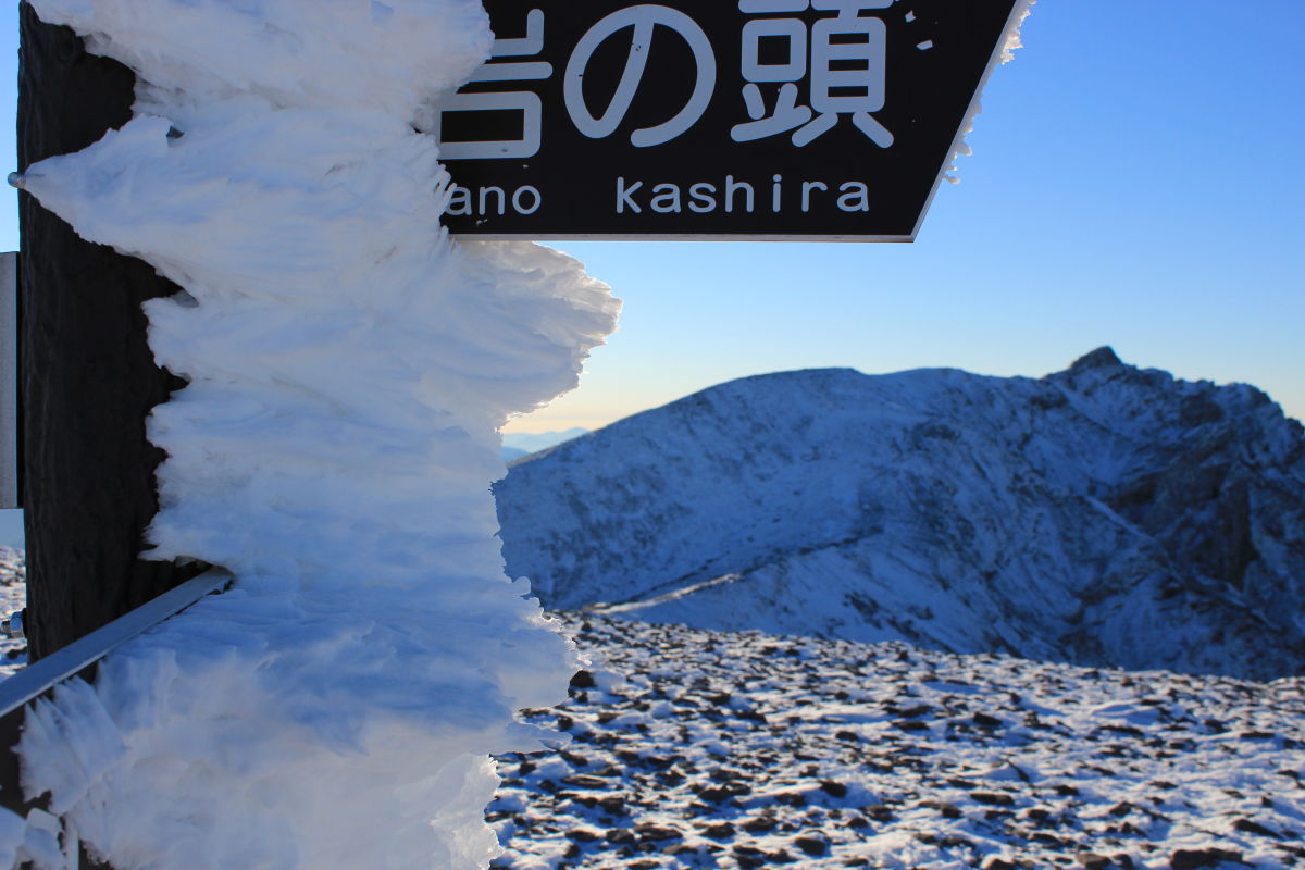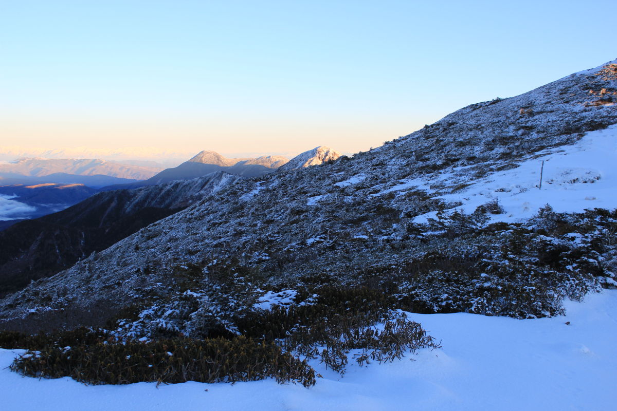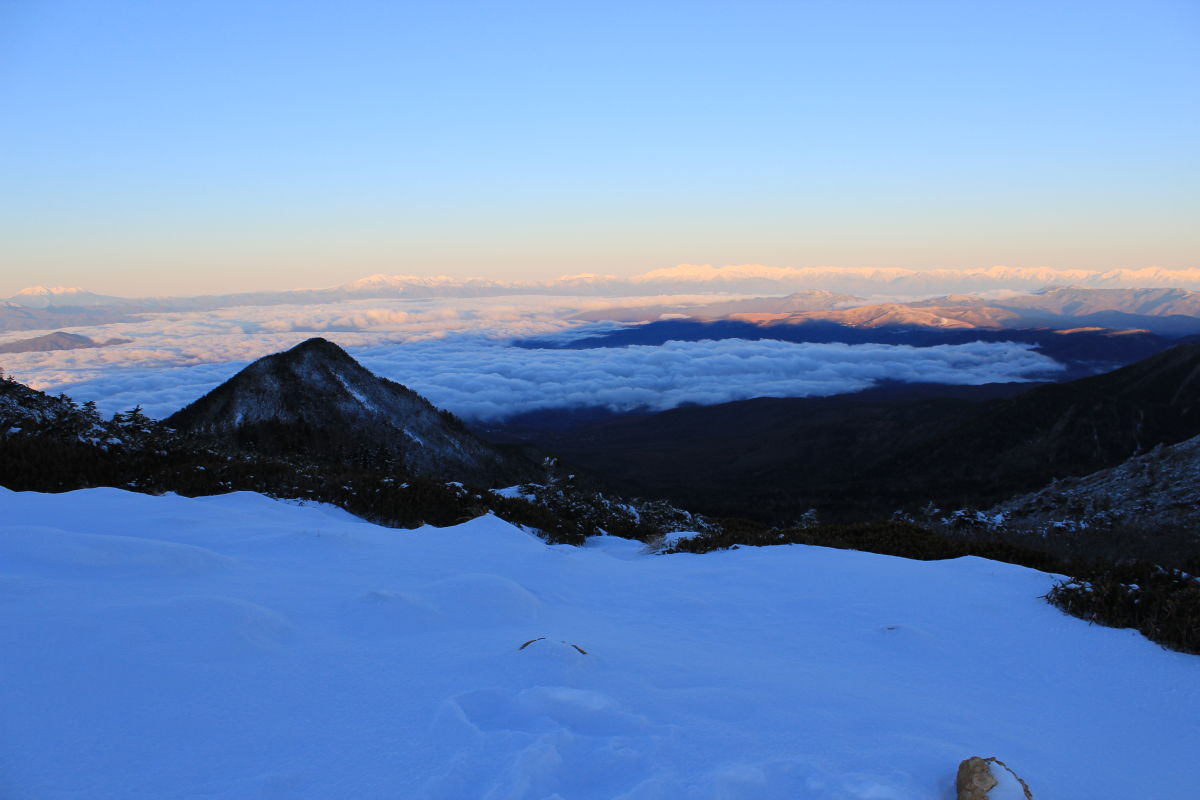 山のなかで下界の夢を見るほど気の滅入ることはない。五時起床、必要最低限の装備だけをザックに詰め込んで、テントはそのままで出発。すぐに夜が明ける。硫黄岳の山頂までは二時間程度、お手軽なコースだが、しっかり積雪。
