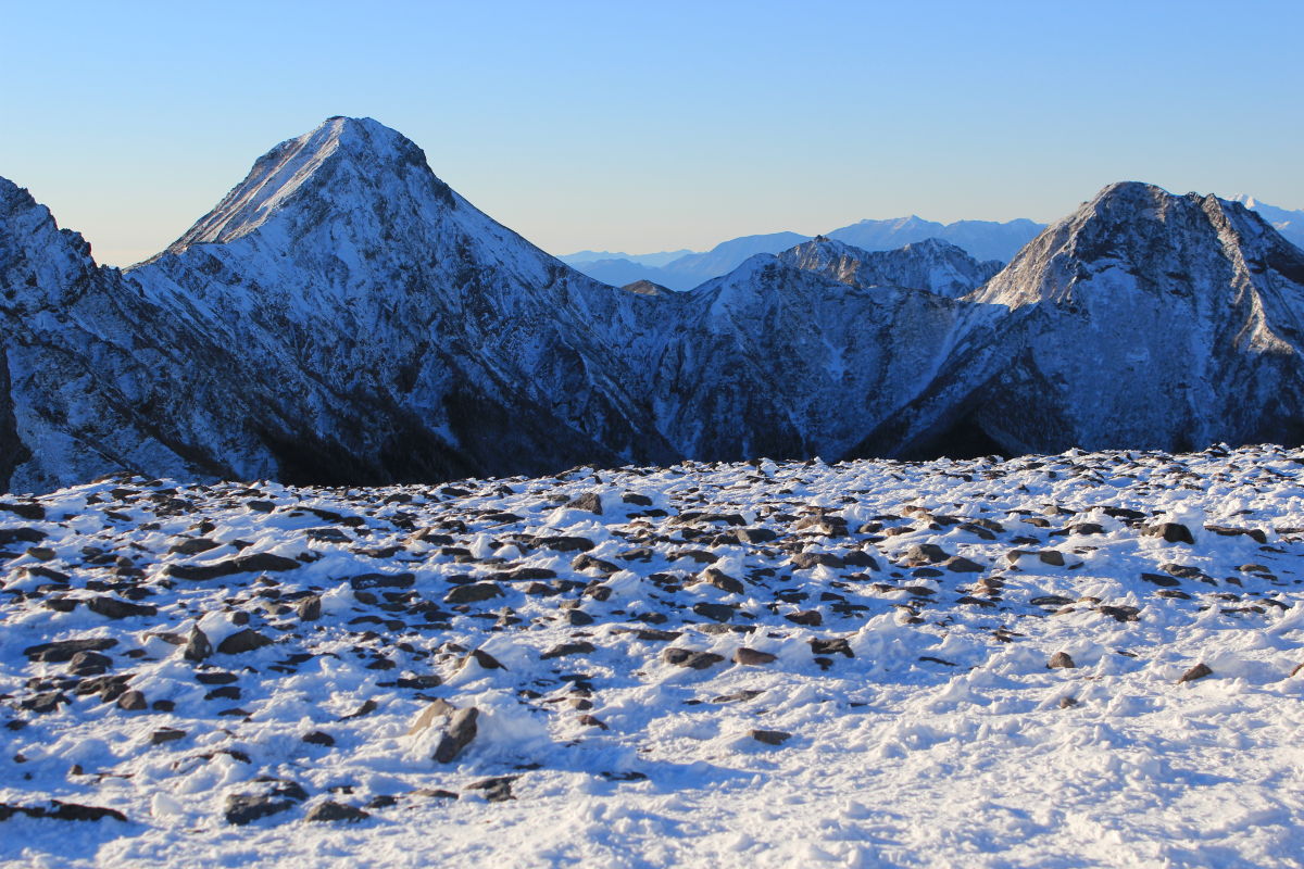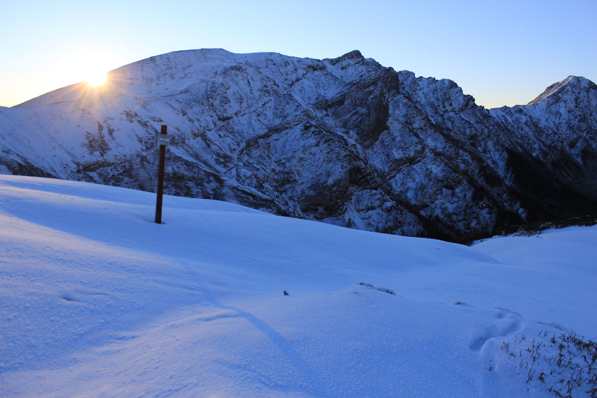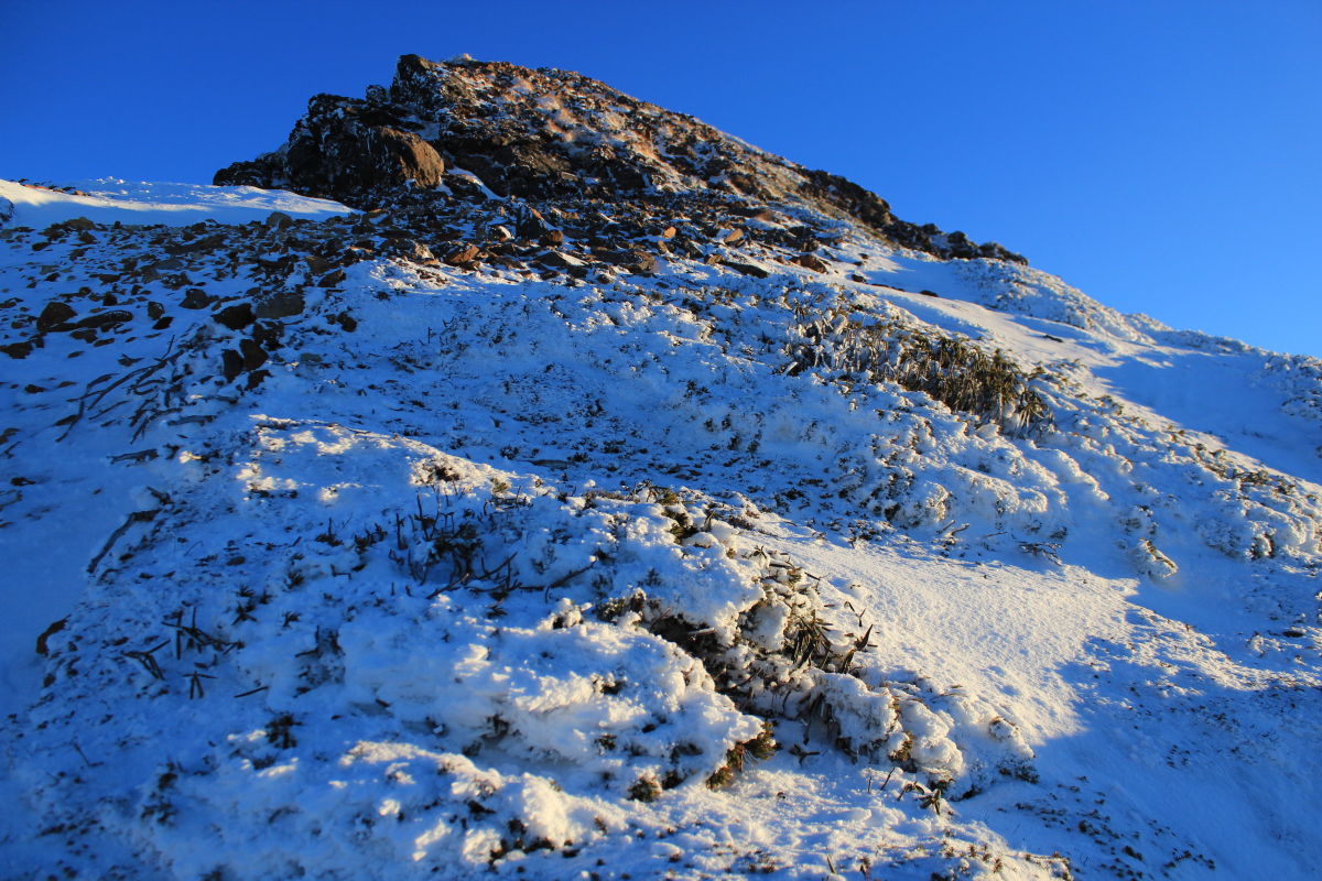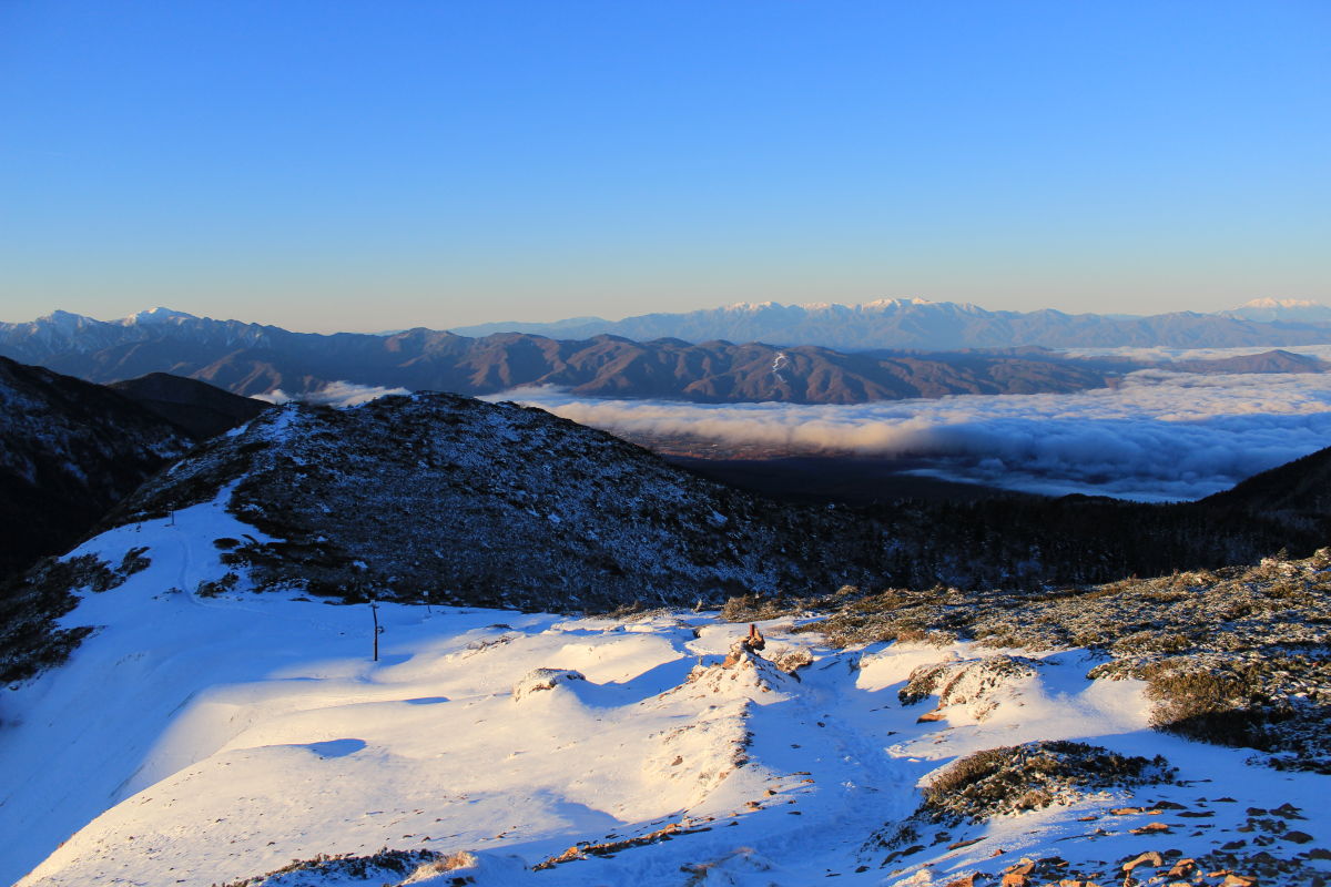山のなかで下界の夢を見るほど気の滅入ることはない。五時起床、必要最低限の装備だけをザックに詰め込んで、テントはそのままで出発。すぐに夜が明ける。硫黄岳の山頂までは二時間程度、お手軽なコースだが、しっかり積雪。